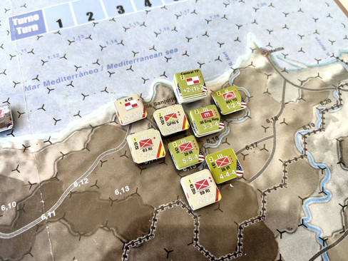 Y me centro ahora quizás en lo que le da al juego la mayor rejugabilidad, los chits de eventos. Ambos bandos tienen una serie de eventos que pueden favorecerles o no, que se deberán sacar en los turnos impares por parte del jugador español y pares por parte del jugador aliado. No voy a explicar todos por no hacer engorrosa esta explicación, pero por tener una idea de lo que se encuentra uno, podrás ir desde eventos que te impiden traer reemplazos al aliado y retirar unidades (ofensiva Tunisia), complejidad en las maniobras entre alemanes y españoles que perjudican con un 1MD a los stacks mixtos, la compra de unidades desertoras españolas por parte del bando aliados (con una tirada especial en determinadas unidades) …. En definitiva, son chits que depende del momento del juego que te salgan te podrán hacer variar la estrategia.