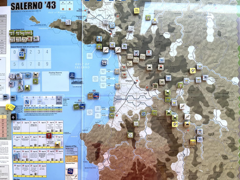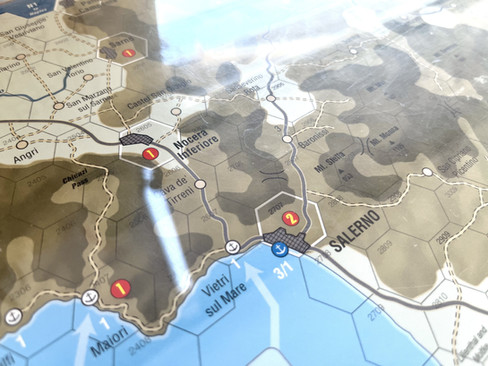 GMT tiene una calidad en los componentes que es indiscutible, lo cual unido a un diseño sencillo y pragmático de Simonitch en mapa, counters… hacen que sus juegos sean fáciles de llegar a un público más amplio. No voy a entrar en describir a fondo el sistema Simonitch de zoc bonds, porque ya lo hice en anteriores post. Como he venido diciendo son juegos fáciles de sacar a mesa (la mayoría) por su sencillez en los mapas (tamaño y número), así como en el número de counters que contienen normalmente. Salerno 43, incide en ellos, un solo mapa de dimensiones estándar y 192 counters entre los que se incluyen los marcadores. Si has jugado a otros juegos del sistema las reglas te serán comunes, solo tendrás que tener en cuenta como se realiza el desembarco en este caso o como usar el terreno para la creación de zocs, porque estamos ante zonas montañosas (es zona muy restrictiva).